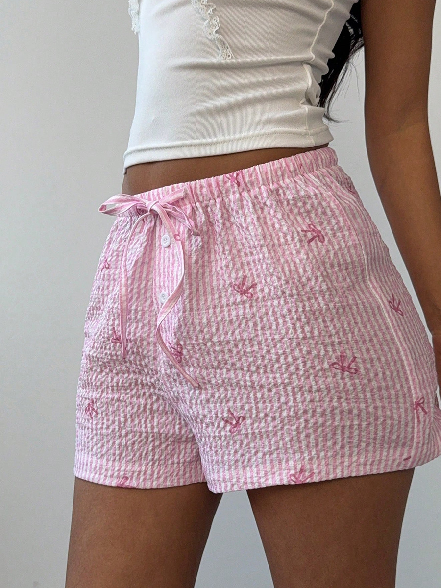 爽やかなストライプ柄が夏らしいレディースショートパンツです。 凹凸のあるサッカー生地を使用しており、肌に張り付きにくく快適な着心地を実現しました。 ウエストはゴム仕様でリラックス感があり、可愛らしいリボンがアクセントになっています。 全体に散りばめられた刺繍がさりげないポイントです。 ルームウェアとしてはもちろん、リゾートやビーチでの着用にも最適なショートパンツです。